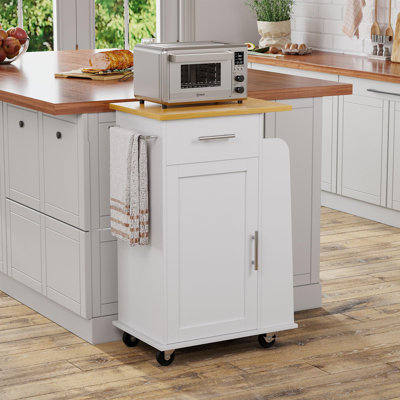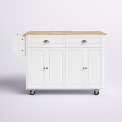 Kissinger 36 H Rolling Kitchen Island with Solid Wood TopThis kitchen island frees up your counter space by adding a work surface, and storage, to your kitchen. Its made from solid and engineered wood with a white finish and features a bamboo countertop. Two slatted doors open to reveal cabinet space with adjustable shelves for dishes, cookbooks, and snacks, while one wide dThree Posts