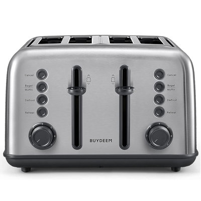 Buydeem 4 Slice Long Slot Crumb Retro ToasterEnjoying your morning routine starts with the Buydeem. Made to bring happiness to your kitchen with no more burnt or wasted toast, the dual sides and 7 shade settings along with unique bread, bagel, or English muffin modes make all the difference. The true bagel mode heats both sides of the bagel initially, then toastsBuydeem