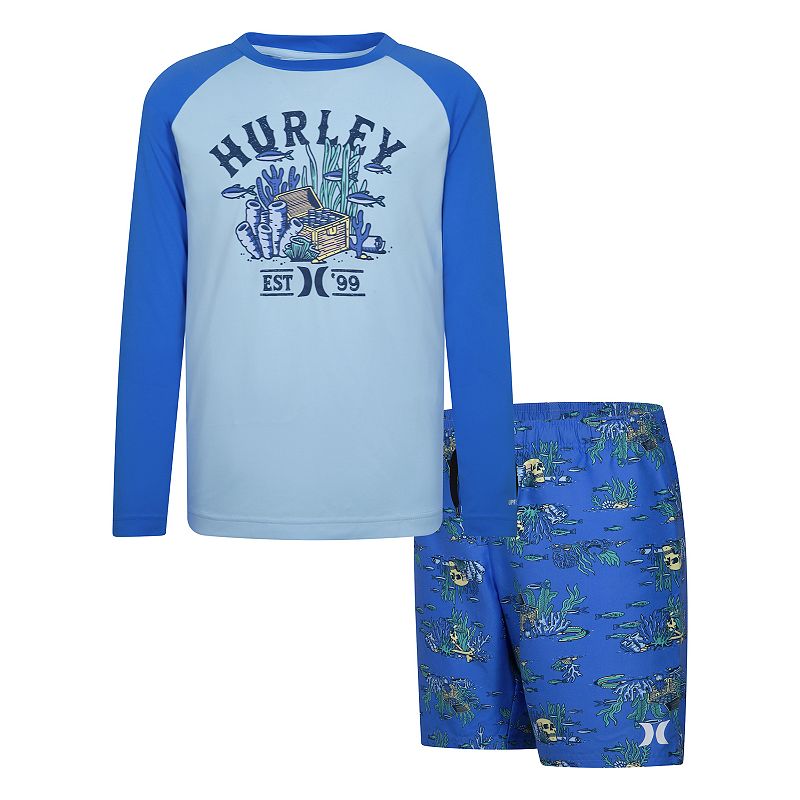 Boys 4-16 Hurley Treasure Hunt Swim UPF 50+ Rash Guard and Trunks Set, Boy's, Blue AopHe'll be ready for a long day at the beach in this boys' Hurley rash guard and swim trunks matching set. He'll be ready for a long day at the beach in this boys' Hurley rash guard and swim trunks matching set. Click on this KIDS APPAREL & SHOES GUIDE to find the perfect fit and more! FEATURES 2-piece set includes: rashHurley
