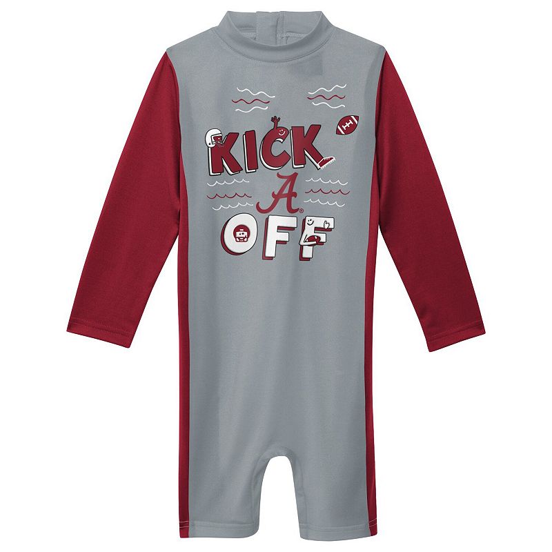 Infant Gray/Crimson Alabama Crimson Tide Wave Runner Wetsuit, Boy's, Size: 12 Months, GreyYour youngster can enjoy a day in the water with this Alabama Crimson Tide Wave Runner wetsuit. It features long sleeves and a button closure that provides proper coverage and comfort for every wear. The front is designed with adorable team graphics and a two-tone design that helps your little fan rep the Alabama CrimsOuterstuff