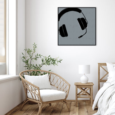 Fioretta Gaming Headset I Framed On Canvas by Leah York PrintArt description: A pair of vintage gaming headphones pops from a chalky gray background. The vague forms of ear cups and a microphone shimmer black with just a hint of detailed highlight. This canvas art print was created by Leah York and printed in Madison, WI. The canvas is stretched by hand and finished with a floatRed Barrel Studio