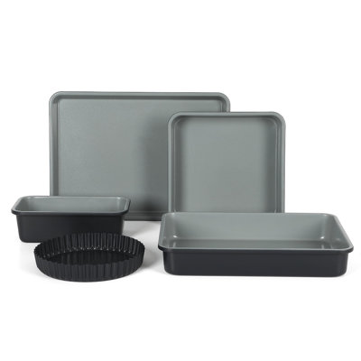 Bisiot 5 Piece Non-Stick Steel Bakeware SetA set of baking utensils, including a 9-inch square cake pan, an 8-inch tart plate, a 9-inch bread plate, a 13 inch baking plate, and a 15 inch baking plate. BisiotBisiot