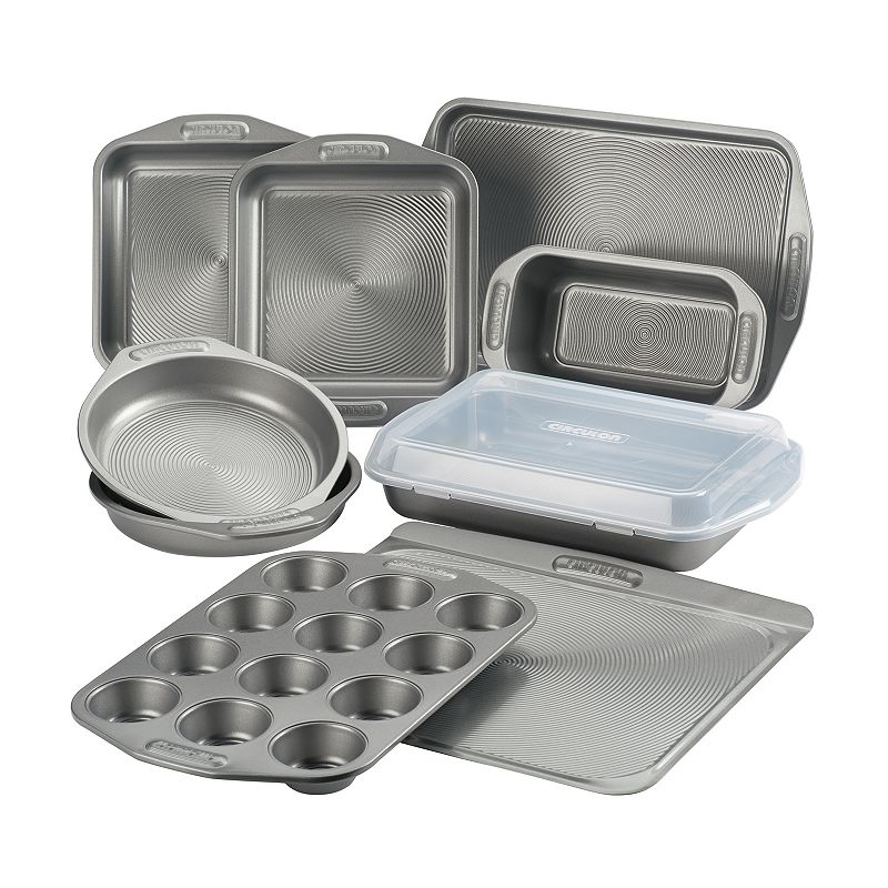 Circulon Nonstick Bakeware 10-Piece Bakeware Set, BrownFor all your baking needs, there's no set so essential, complete, or baker-friendly as this delightful set from Circulon. Premium-nonstick-coated surface of raised circles for exceptional nonstick performance Heavy-gauge steel construction with warp-resistant, rolled-rim design for beautiful, long-lasting baking perforCirculon