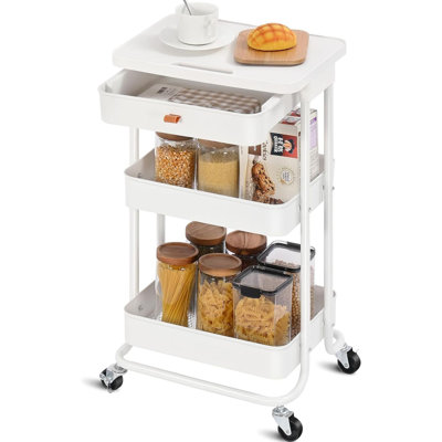 Rolling Storage Cart With Drawer & Table Top, 3 Tier Metal Rolling Utility Cart, White Rolling Cart OrganizerThe metal rolling cart with plastic drawer and tabletop is perfect for office supplies and teacher essentials and craft supplies.The rolling storage cart is ideal as pantry cart, kitchen cart, living room cart, bedside cart, bathroom cart.The 3 tier rolling serving cart is well constructed with heavy duty metal basketsRainbow Home